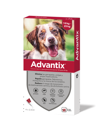Les pipettes Advantix sont un antiparasitaire efficace qui repousse les puces, les tiques, les poux et le moustique de la leishmaniose. Ils conviennent aux chiens de taille moyenne pesant entre 10 et 25 kg. Leurs effets sont rapides et durables pour assurer la protection.