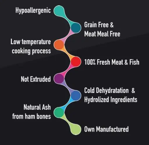 Viande et poisson frais partiellement hydrolysés (35% de viande de dinde fraîche, 20% de poisson entier frais (sardinella aurita), maquereau (Scomber scombrus), chinchard (Trachurus