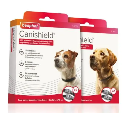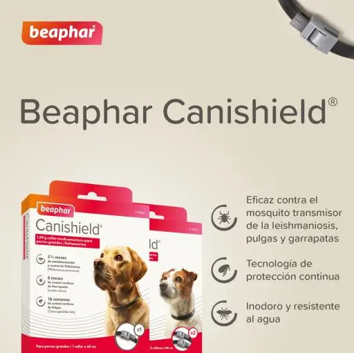Le collier Beaphar Canishield contient un insecticide, la deltaméthrine, qui est libéré lentement par la matrice en polyéthylène du collier. Canishield tue les puces jusqu’à seize semaines, les tiques jusqu’à six mois et les phlébotomes jusqu’à cinq mois et demi.