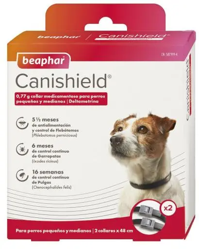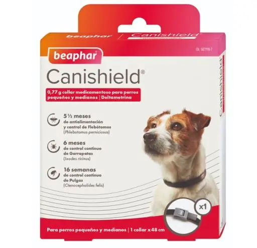 Le collier Beaphar Canishield contient un insecticide, la deltaméthrine, qui est libéré lentement par la matrice en polyéthylène du collier. Canishield tue les puces jusqu’à seize semaines, les tiques jusqu’à six mois et les phlébotomes jusqu’à cinq mois et demi.