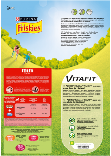 Nourriture Friskies avec du buf pour chiens adultes de petites races. Les croquettes Friskies Mini Menu sont plus petites et plus délicieuses, adaptées à ceux animaux de compagnie. Le complexe Vitafit remplit votre animal dénergie et de vitalité, avec des vitamines et des acides gras essentiels. Disponible en 2 formats.