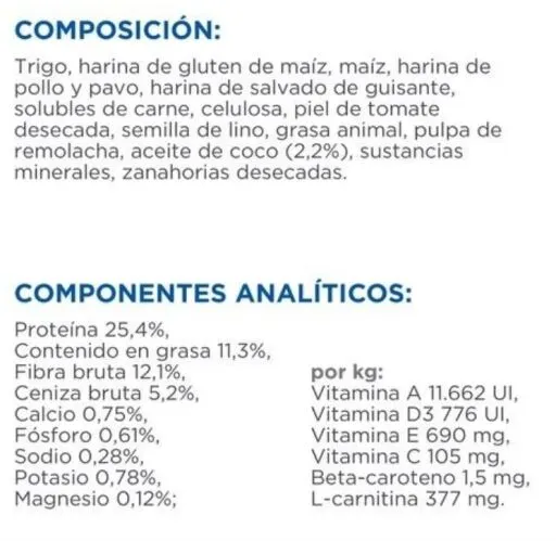Blé, farine de gluten de maïs, maïs, farine de poulet et de dinde, farine de son de pois, solubles de viande, cellulose, écorce de tomate séchée, graines de lin, graisse animale, pulpe de betterave, huile de coco (2,2%), substances minérales, carottes séchées.