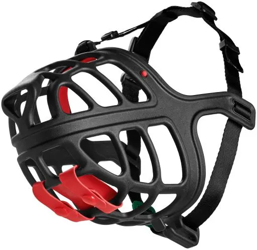 Cette muselière représente une véritable innovation à plusieurs égards, le confort et le bien-être du chien étant des priorités absolues. La muselière est fabriquée à partir d’une seule pièce de plastique et l’utilisation d’un élastomère thermoplastique (TPE) garantit qu’elle est particulièrement flexible sans perdre sa durabilité. Le rembourrage autour du nez et du front permet un ajustement confortable sur ces parties sensibles du visage. La grille avec de grands espaces permet au chien de haleter et de boire de l’eau, même les petites friandises peuvent facilement passer à travers. Le protège-museau amovible est une caractéristique particulièrement spéciale, car il peut sauver la vie d’un chien en l’empêchant de ramasser des appâts empoisonnés. Les sangles en nylon réglables à l’infini garantissent que la muselière reste fermement fixée et ne peut pas être enlevée par le chien, mais ne limite pas les mouvements de l’animal. Le crochet intégré permet d’attacher la muselière directement au collier.