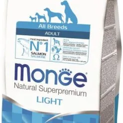 Monge Natural Formule de saumon et de riz léger Superpremium adulte sans soja. Nourriture complète pour les chiens adultes de toutes tailles.
