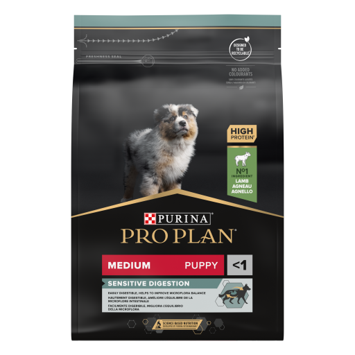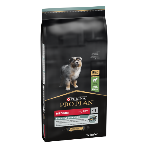 PURINA® PRO PLAN® Medium Puppy Sensitive Digestion avec OPTIDIGEST® riche en agneau est un aliment sec complet pour les chiots de race moyenne à la digestion sensible. Il convient également aux chiennes enceintes et allaitantes.
