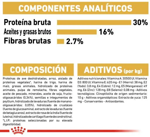 Riz, protéines de volaille déshydratées, isolat de protéines végétales*, graisses animales, hydrolysat de protéines animales, fibres végétales, pulpe de betterave, sels minéraux, huile de poisson, huile de soja, fructo-oligo-saccharides, téguments et graines de psyllium, hydrolysat de levure (source de manno oligo-saccharides), hydrolysat de crustacé (source de glucosamine), extrait de rose d’Inde (source de lutéine), hydrolysat de cartilage (source de chondroïtine).