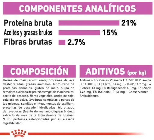 COMPOSANTS ANALYTIQUES : Protéines brutes : 21,0% – Matières grasses brutes : 15,0% – Cendres brutes : 5,3% – Fibres brutes : 2,7%.