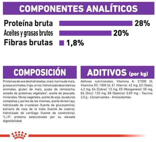 COMPOSITION: Protéines de volaille déshydratées, farine de maïs, maïs, graisses animales, gluten de maïs, hydrolysat de protéines animales, sels minéraux, isolat de protéines végétales*, pulpe de betterave, huile de poisson, fibres végétales, huile de soja, levures, huile de bourrache, hydrolysat de crustacé (source de glucosamine), extrait de rose d’Inde (source de luétine), hydrolysat de cartilage (source de chondroïtine).