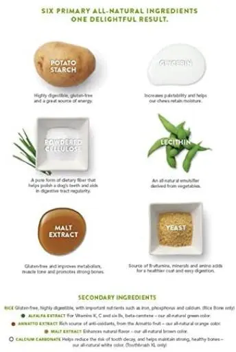 Les snacks dentaires WHIMZEES réunissent 2 éléments importants pour la santé et le bonheur de votre chien : la propreté dentaire et le plaisir de la mastication ! Le design unique et la texture végétale de WHIMZEES assurent une bonne circulation du sang entre les gencives et préviennent également la mauvaise haleine et l’accumulation de la plaque et du tartre. Tous les snacks dentaires WHIMZEES sont fabriqués à partir de 6 ingrédients naturels principaux, qui garantissent un résultat délicieux : – Fécule de pomme de terre : très digeste, sans gluten et une grande source d’énergie. – Glycérine : renforce la saveur et aide nos produits à mâcher à conserver leur humidité. – Cellulose en poudre : Une forme pure de fibre alimentaire qui aide à polir les dents de votre chien et favorise un tube digestif régulier. – Lécithine : émulsifiant naturel d’origine végétale. – Extrait de malt : sans gluten, améliore le métabolisme, le tonus musculaire et favorise la solidité des os. – Levure : Source de vitamine B, de minéraux et d’acides aminés pour un pelage plus sain et une digestion plus facile. Même ses couleurs proviennent d’extraits naturels : – Extrait de luzerne : apporte de la vitamine K, C et six du complexe B, la couleur bêta-carotène est d’un vert tout à fait naturel. – Extrait d’Onoto : Riche source d’antioxydants, provenant du fruit de l’Onoto, de couleur orange entièrement naturelle. – Extrait de malt : rehausse son goût naturel. La couleur est un brun entièrement naturel. – Carbonate de calcium : aide à réduire le risque de carie dentaire et à maintenir des os forts et sains ; la couleur est d’un blanc naturel. (Uniquement dans la brosse à dents XL) Ils sont également riches en fibres et pauvres en calories et en sucres. INGRÉDIENTS Amidon de pomme de terre, glycérine, poudre de cellulose, lécithine, levure, colorant ajouté (extrait de malt, extrait d’onoto, extrait de luzerne). COMPOSANTS ANALYTIQUES Protéines brutes (min.) : 1,1% ; Matières grasses brutes (min.) : 2,3% ; Matières grasses brutes (max.) : 4,0% ; Fibres brutes (max.) : 13,7% ; Humidité (max.) : 12,0%.